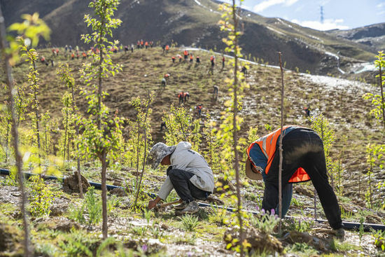 2023年6月18日,工人在西藏拉薩市城關(guān)區(qū)次角林村附近的山上播種造林。新華社記者 孫非 攝