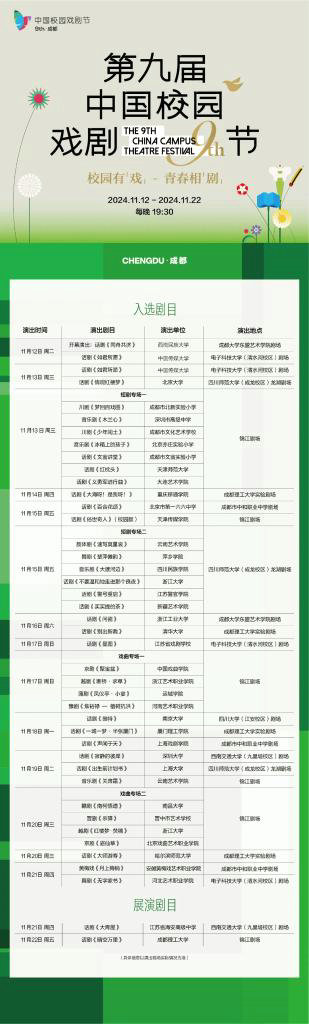 第九屆中國校園戲劇節(jié)將于11月12日至22日在成都舉辦。為進(jìn)一步體現(xiàn)戲劇節(jié)公益性,大部分演出安排在各高校的校內(nèi)劇場,并面向社會招募觀眾。