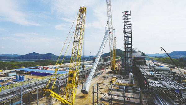 就在上個(gè)月底,建設(shè)者們還攻克了另一個(gè)難關(guān)——總長66.39米的脫甲烷塔整體運(yùn)輸?shù)跹b到位。潘輝介紹,這個(gè)脫甲烷塔大約有22層樓高,重量達(dá)245噸,“起吊的履帶吊,僅配件就有40輛貨車運(yùn)輸,花了一周時(shí)間才裝上。”兩臺(tái)履帶吊,拉著一頭一尾同時(shí)起吊,經(jīng)過精確到毫米的控制,穩(wěn)穩(wěn)地送進(jìn)固定鋼結(jié)構(gòu)梁里。