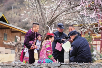 2023年3月26日,平武縣白馬藏族鄉(xiāng)派出所民警在藏寨開展防范電信網絡詐騙宣傳活動。