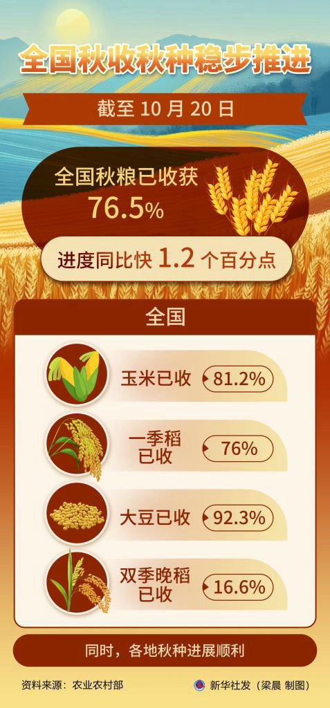 新華社北京10月21日電(記者于文靜)目前,全國秋收秋種正穩(wěn)步推進(jìn)。截至10月20日,全國秋糧已收獲76。5%,進(jìn)度同比快1。2個百分點(diǎn)。