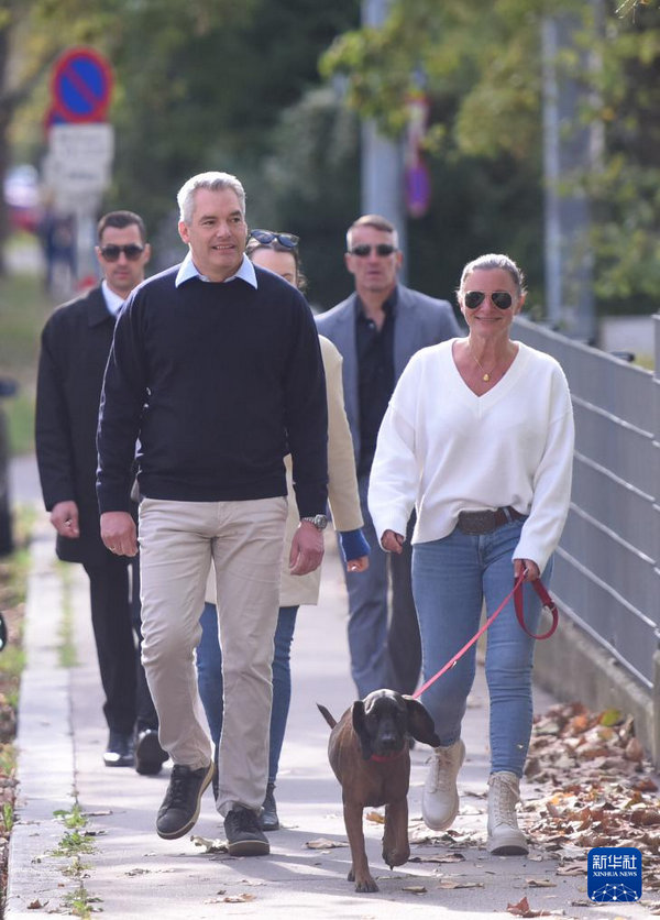 這是9月29日,奧地利總理、人民黨黨首內(nèi)哈默(前左)前往維也納的一處投票站參加奧地利國(guó)民議會(huì)選舉投票。新華社記者 賀燦鈴 攝