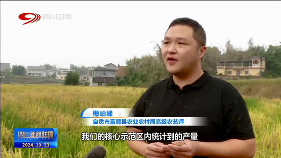 自貢市富順縣農(nóng)業(yè)農(nóng)村局高級農(nóng)藝師 梅岫峰:我們的核心示范區(qū)內(nèi)統(tǒng)計到的產(chǎn)量,(中稻畝產(chǎn))達到了667公斤,再生稻測產(chǎn)(畝產(chǎn))達到了403公斤,兩季畝產(chǎn)(量)突破了噸糧。