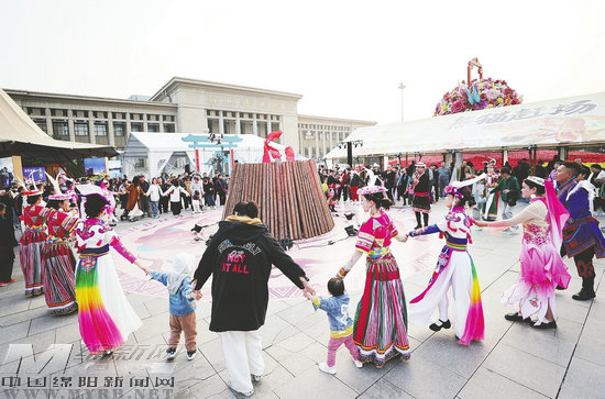 在石家莊文化廣場,當(dāng)?shù)厥忻衽c白馬姑娘小伙跳起了圓圓舞。
