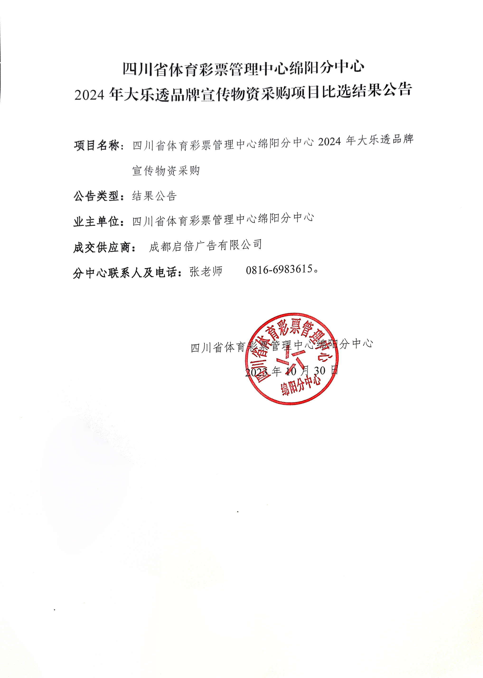 四川省體育彩票管理中心綿陽分中心2024年大樂透品牌宣傳物資采購項目比選結(jié)果公告