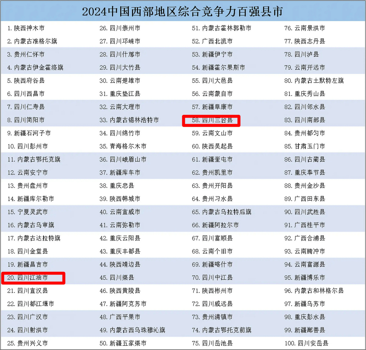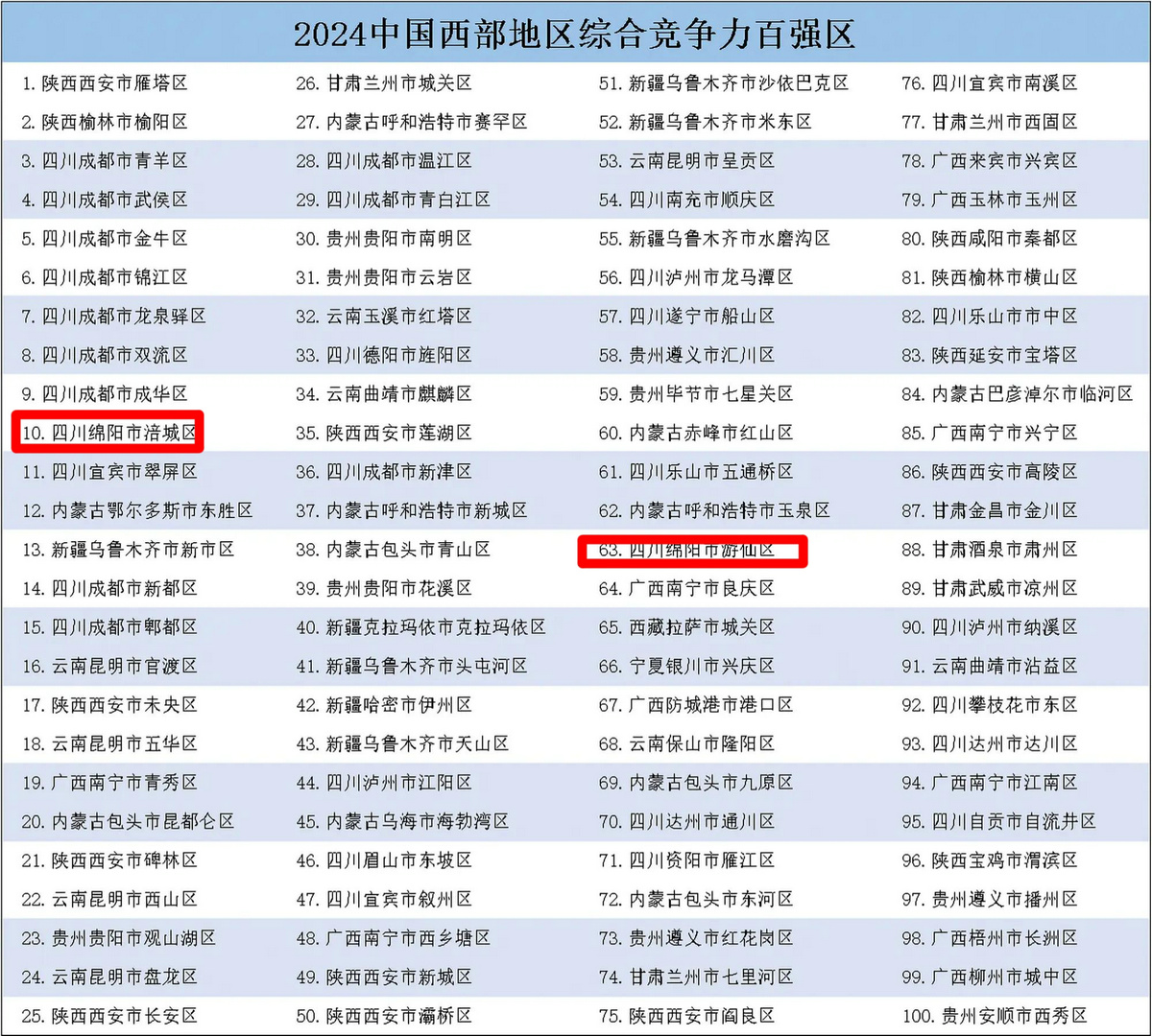 近日,競爭力智庫、北京中新城市規(guī)劃設(shè)計研究院等機構(gòu)在北京發(fā)布《中國西部地區(qū)縣域發(fā)展監(jiān)測報告2024》(簡稱《報告》),揭曉2024中國西部地區(qū)綜合競爭力百強區(qū)、2024中國西部地區(qū)綜合競爭力百強縣市名單。綿陽市涪城區(qū)、游仙區(qū)、江油市和三臺縣榜上有名。