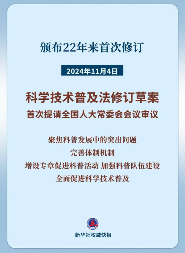 科學(xué)技術(shù)普及是實(shí)現(xiàn)創(chuàng)新發(fā)展的重要基礎(chǔ)性工作。11月4日,科學(xué)技術(shù)普及法修訂草案首次提請(qǐng)全國(guó)人大常委會(huì)會(huì)議審議,這是科學(xué)技術(shù)普及法自2002年公布施行以來(lái)首次修訂。
