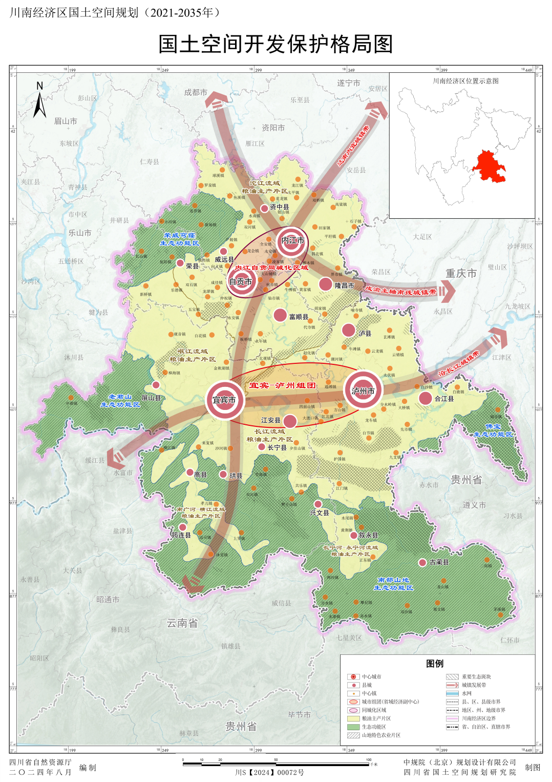 2023年川南經(jīng)濟(jì)區(qū)地區(qū)生產(chǎn)總值破萬(wàn)億,經(jīng)濟(jì)總量位居全省第二。勢(shì)頭足,短板也突出,面臨核心城市能級(jí)不足,重點(diǎn)產(chǎn)業(yè)、公共服務(wù)等方面交叉重復(fù)等情況。對(duì)此,《川南經(jīng)濟(jì)區(qū)國(guó)土空間規(guī)劃(2021—2035年)》(簡(jiǎn)稱(chēng)“川南經(jīng)濟(jì)區(qū)規(guī)劃”》)進(jìn)一步引導(dǎo)城鎮(zhèn)和產(chǎn)業(yè)空間高效集聚。