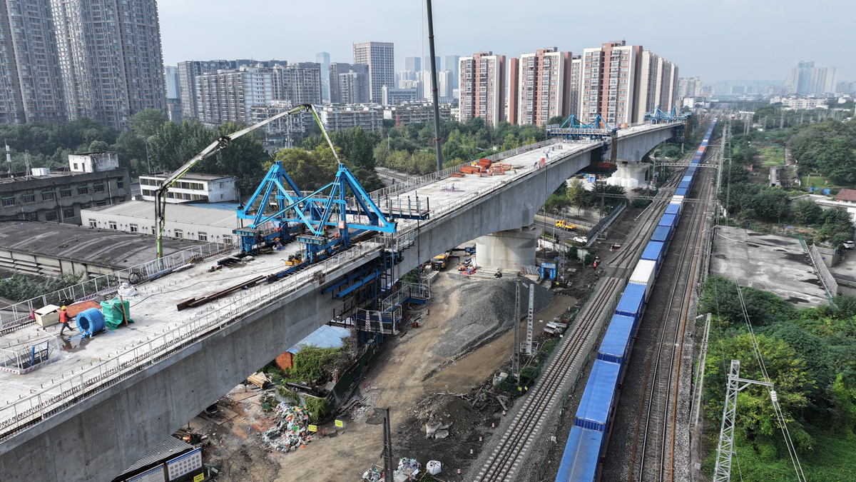 成渝中線高鐵動走線跨沙河特大橋位于四川省成都市金牛區(qū),全長約1.47公里,以現(xiàn)澆連續(xù)梁方式跨越沙河、既有駟馬橋城市主干道路、成都地鐵3號線及新建客機整備所西咽喉區(qū)。其中,主跨采用“掛籃懸臂澆筑施工法”施工,施工人員將連續(xù)梁分為14個標準節(jié)段施工,共澆筑混凝土9000余立方米,相當于約4個奧運會標準游泳池的容量。