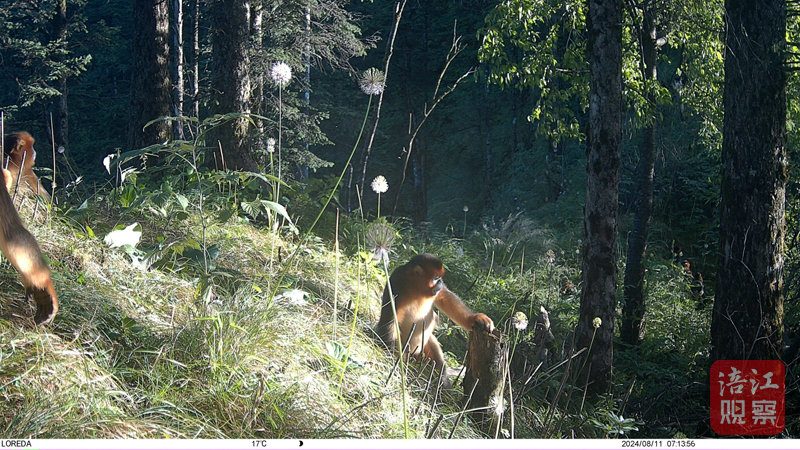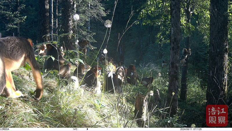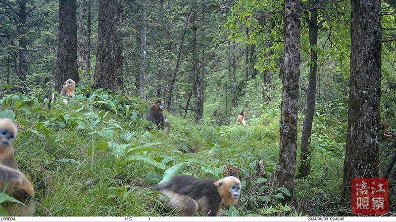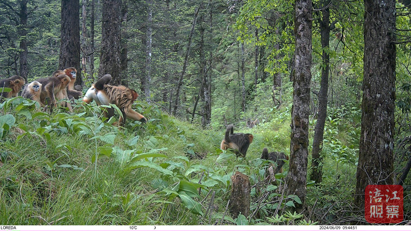 還發(fā)現(xiàn)了一群川金絲猴組隊曬娃的畫面