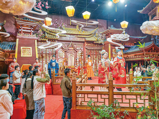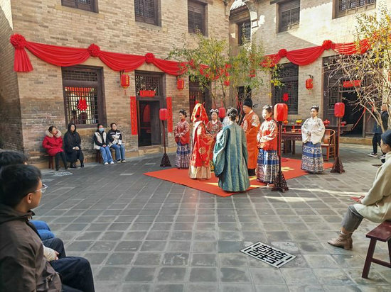 喜鎮(zhèn)蘇莊的古院落中,正在上演一場“出閣禮”表演,吸引游客前來參觀。新華每日電訊記者許雄 攝