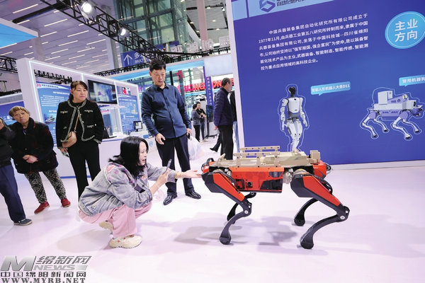 11月7日,第十二屆中國(綿陽)科技城國際科技博覽會現(xiàn)場,市民與機器狗互動。