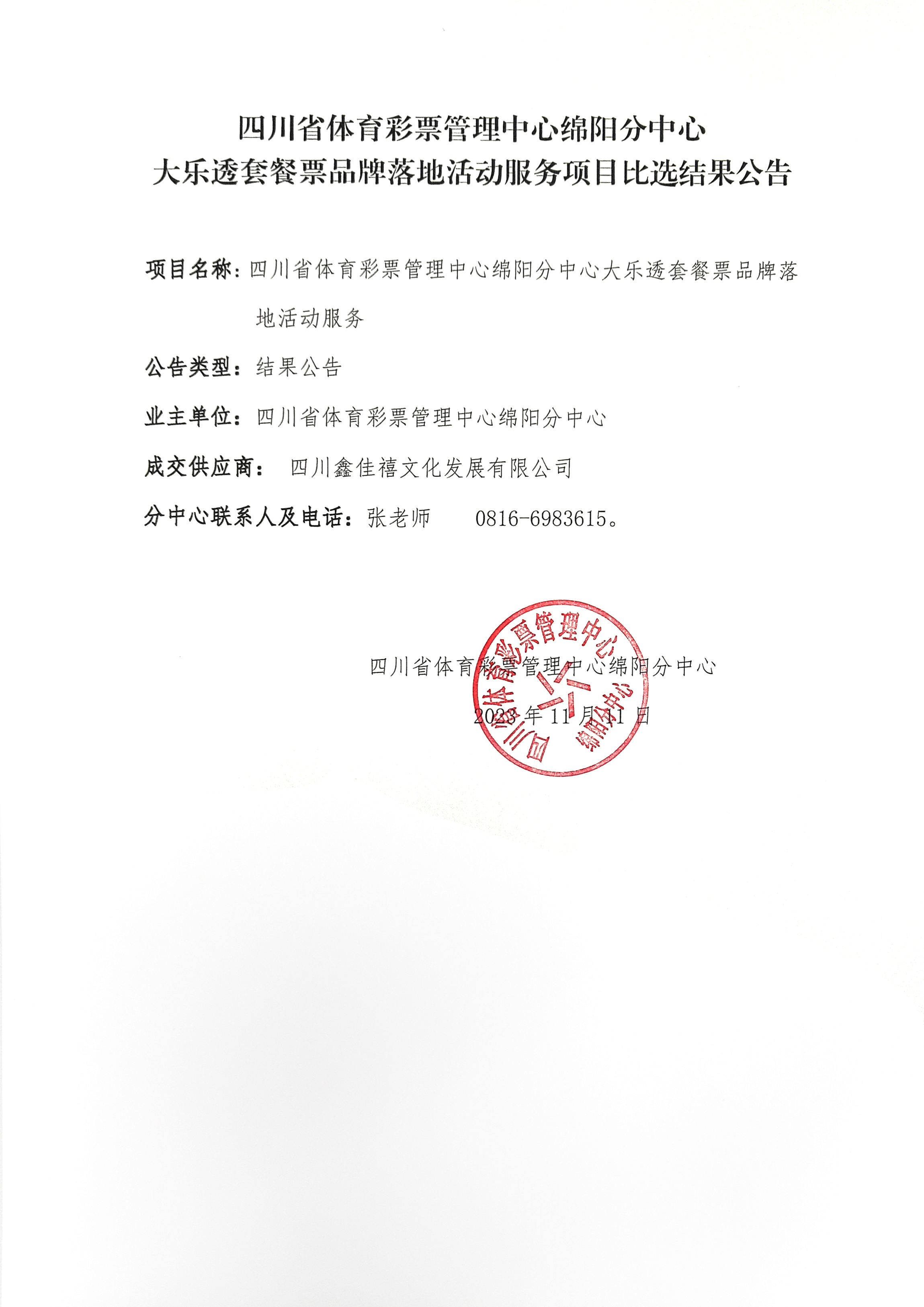四川省體育彩票管理中心綿陽(yáng)分中心大樂(lè)透套餐票品牌落地活動(dòng)服務(wù)項(xiàng)日比選結(jié)果公告