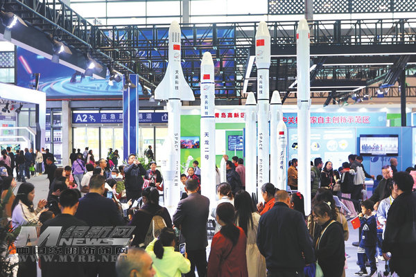 在綿陽(yáng)會(huì)展中心A館前沿科技展區(qū),火箭模型吸引眾多觀眾打卡。(記者 陳冬冬 攝)