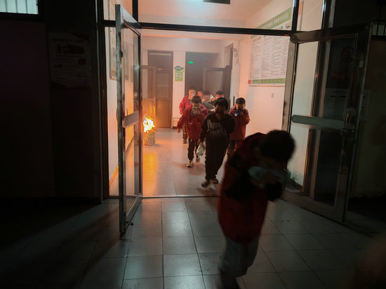 隨著廣播里傳出“秀水一小夜間學(xué)生宿舍火災(zāi)逃生應(yīng)急演練正式開始”,各樓層生活老師立即組織學(xué)生用濕毛巾捂住口鼻,彎著腰,低著頭,向前小跑,按照預(yù)定的疏散線路快速、有序撤離到學(xué)校操場。整個演練過程既緊張,又有序,慌而不亂,實用性強(qiáng),達(dá)到了預(yù)期效果。