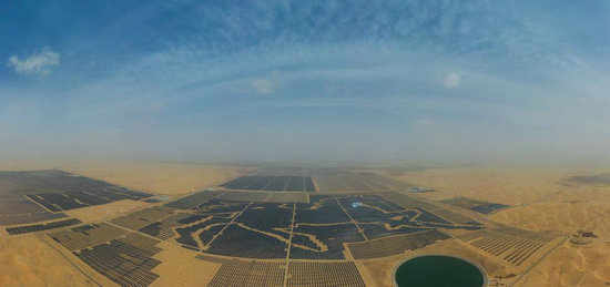 在內(nèi)蒙古自治區(qū)鄂爾多斯市境內(nèi)的庫(kù)布其沙漠里,一排排光伏板整齊地排列著,像是一幅藍(lán)色畫布在沙海中熠熠生輝。然而在過(guò)去,“黃沙遮天日,飛鳥(niǎo)無(wú)棲樹(shù)”是人們對(duì)這片沙海的印象。