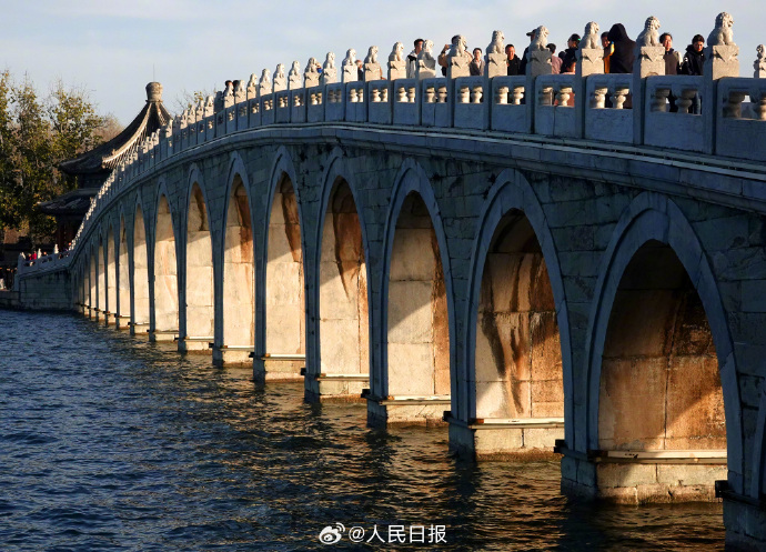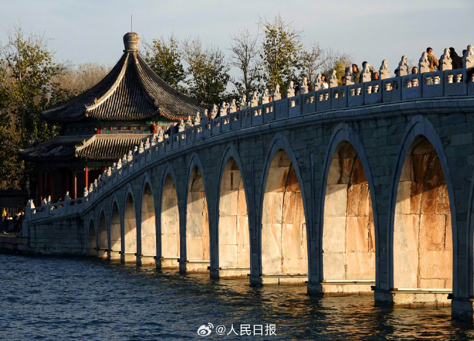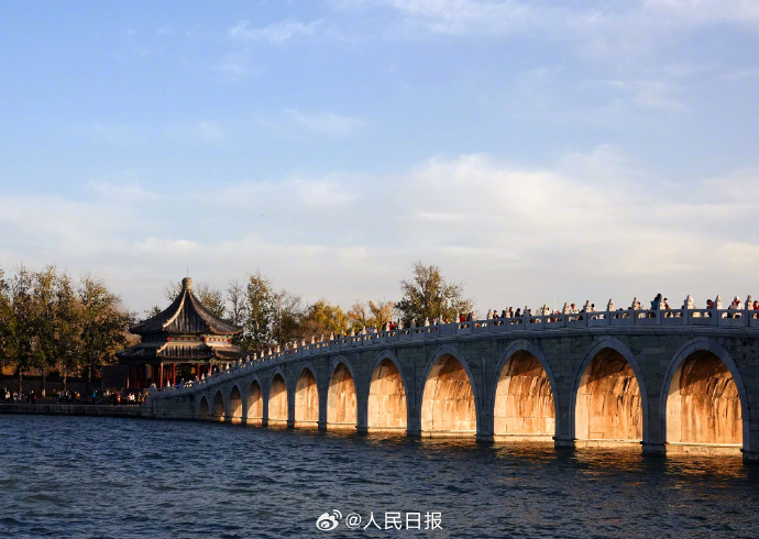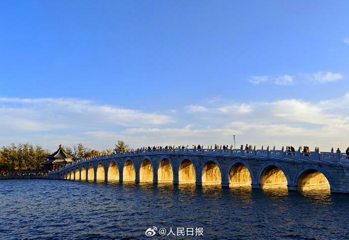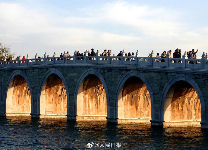 11月16日,北京,頤和園十七孔橋再現(xiàn)“金光穿洞”景致,美不勝收,吸引游客打卡觀賞拍照。