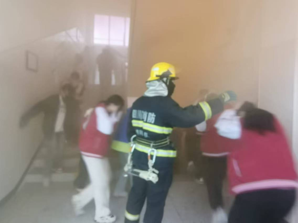 隨著警報聲拉響,演練正式開始。師生們反應(yīng)迅速,紛紛用手捂住口鼻,彎腰并靠墻沿著預(yù)定疏散路線快速撤離。各班學(xué)生在老師的組織下井然有序,樓梯口疏導(dǎo)人員堅守崗位,確保通道暢通。整個校園氛圍緊張但不慌亂。