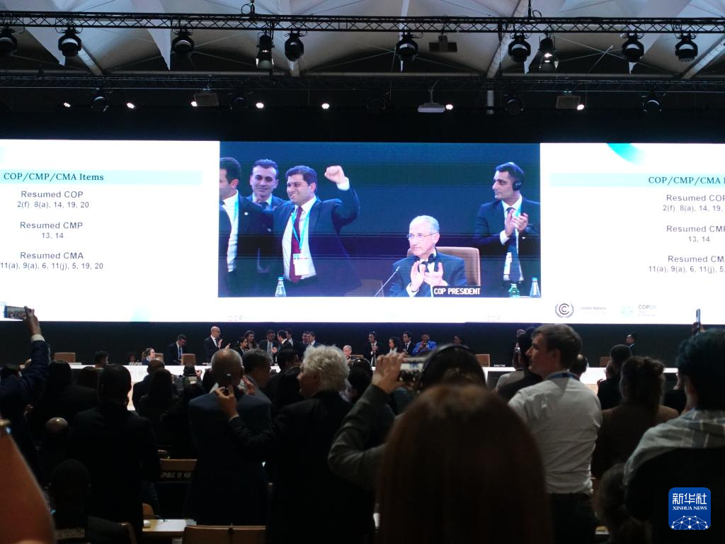 11月24日凌晨,在阿塞拜疆首都巴庫(kù),談判代表們慶祝一項(xiàng)重要決議通過(guò)。新華社記者 安曉萌 攝