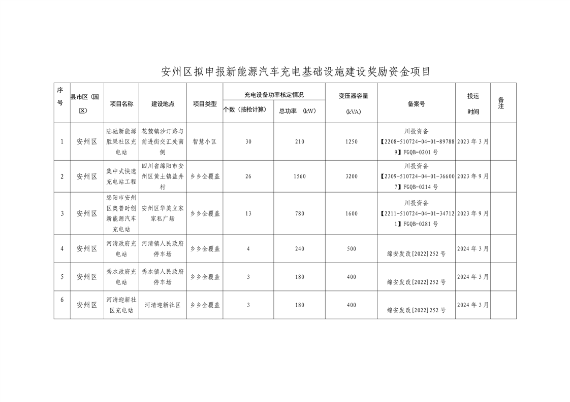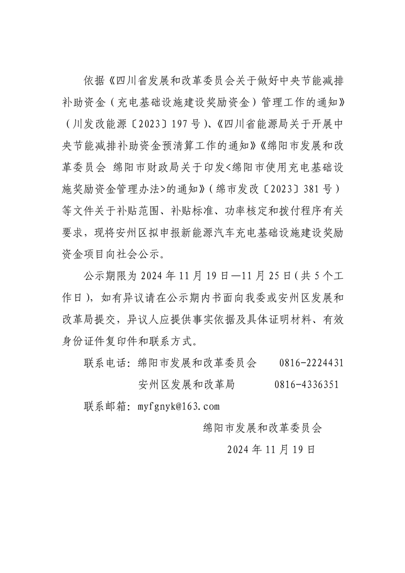 綿陽市發(fā)展和改革委員會關(guān)于安州區(qū)擬申報充電基礎(chǔ)設(shè)施建設(shè)獎勵資金項目的公示
