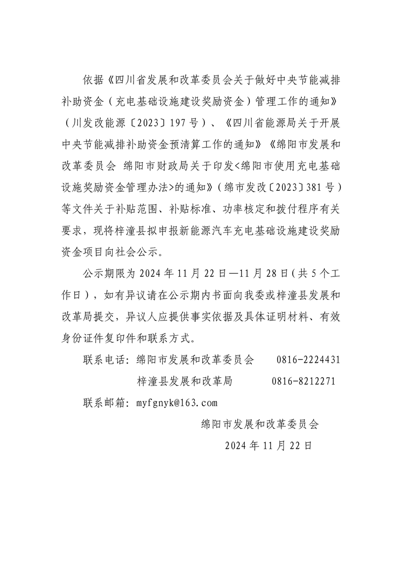 綿陽(yáng)市發(fā)展和改革委員會(huì)關(guān)于梓潼縣擬申報(bào)充電基礎(chǔ)設(shè)施建設(shè)獎(jiǎng)勵(lì)資金項(xiàng)目的公示