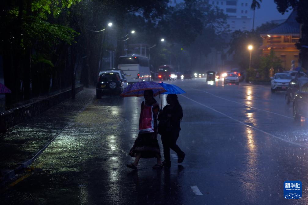 11月26日,在斯里蘭卡科倫坡,人們走過積水的街道。