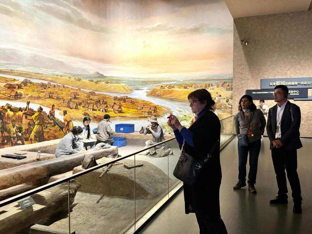 11月25日,在位于浙江杭州的良渚博物院,國際考古學者在展廳中感受良渚遺址的考古成果及其價值。新華社記者 鄭可意 攝