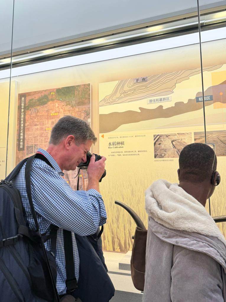 栽培稻、成套農(nóng)用工具、灌溉系統(tǒng)……走進位于浙江杭州的良渚博物院,英國杜倫大學考古學者羅賓·科寧哈姆頻頻用相機記錄所見,不放過任何感興趣的細節(jié)。