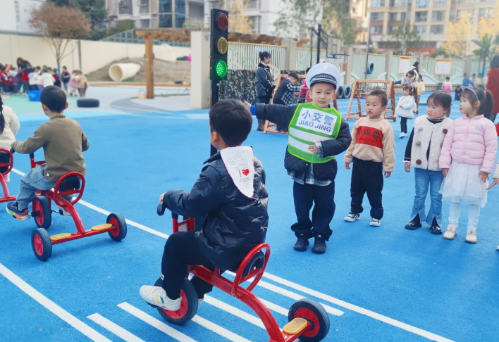 活動伊始,老師們借助《小熊過馬路》等繪本故事,向幼兒講解交通標(biāo)識、信號燈意義、過馬路的正確方法以及遵守交通規(guī)則的重要性。隨后,操場搖身變?yōu)?ldquo;交通演練場”,設(shè)有模擬十字路口、交通標(biāo)志認(rèn)知區(qū)、行人過街體驗區(qū)等。孩子們在模擬十字路口,認(rèn)真觀察信號燈的變化,學(xué)著交警叔叔的模樣,有模有樣地指揮交通;在交通標(biāo)志認(rèn)知區(qū),積極討論標(biāo)志的含義與用途;在行人過街體驗區(qū),幼兒們排著整齊的隊伍,等待綠燈亮起后,小心翼翼地走過“馬路”......通過這些豐富的體驗活動,孩子們不僅對交通規(guī)則有了更直觀深刻的理解,也在實踐中提升了自己的交通安全意識與自我保護(hù)能力。