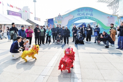 活動(dòng)現(xiàn)場(chǎng),身穿紅黃萌獅套裝的機(jī)器狗大方迎客,還時(shí)不時(shí)跟大家打招呼。如此聰明可愛的機(jī)器“團(tuán)寵”,讓南京市民忍不住排隊(duì)跟它合影。“快,幫我合個(gè)影!”“我也要!”……