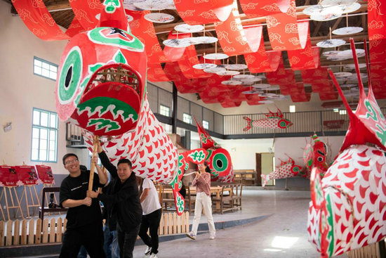村民在安徽省黃山市歙縣溪頭鎮(zhèn)汪滿田村魚燈工坊內練習舞動長約8米的魚燈(5月10日攝)。新華社記者 傅天 攝