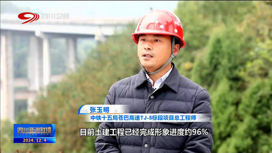 中鐵十五局蒼巴高速TJ-5標(biāo)段項目總工程師 張玉明:目前土建工程已完成形象進度約96%,路面工程已完成約69%,為加快施工進度,爭取早日通車,四季度我們積極增加資源配置,科學(xué)倒排工期,以日考核來保節(jié)點,確保年底前完成土建工程,春節(jié)前完成路面工程。