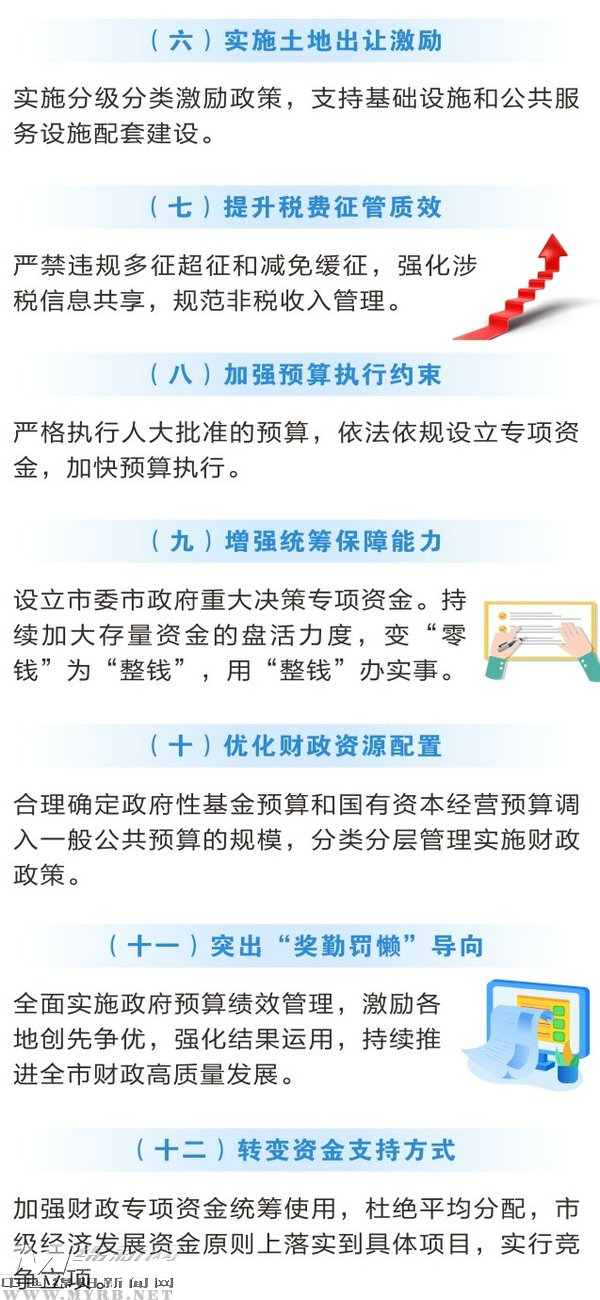 該措施共十八條,要求立足深入實施“五市戰(zhàn)略”,加快發(fā)展新質(zhì)生產(chǎn)力,全面樹立“獎勤罰懶”激勵約束導向,構(gòu)建涵蓋資金、資產(chǎn)、資源、資本的“大財政”收入管理格局,健全“集中財力辦大事”支出保障機制,切實防范化解風險,增強財政可持續(xù)性。