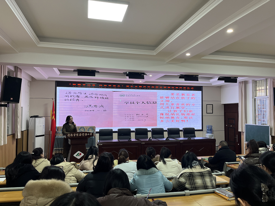 馮月老師以《語林漫步 教海遨游》為題,從“全面關(guān)注,鼓勵發(fā)言;聽寫訓(xùn)練,夯實基礎(chǔ);書山有路,教海無涯;點亮心燈,照亮前程”這四個方面分享了她在教育教學(xué)以及家校合作方面的先進(jìn)做法。