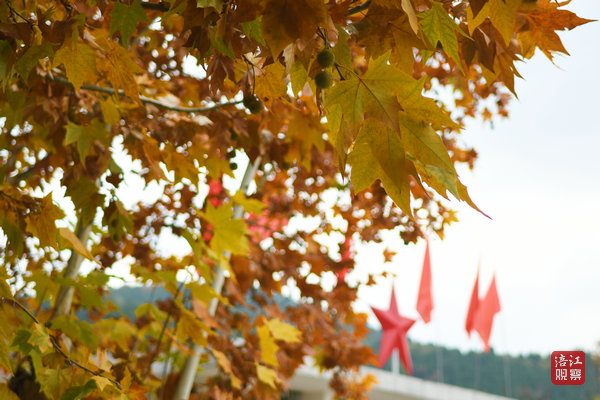紅旗、上世紀60年代建筑與金黃的梧桐葉遙相呼應(yīng),仿佛在訴說那段為國奉獻的歷史。游客在這片金色的海洋中,享受著寧靜與美好。