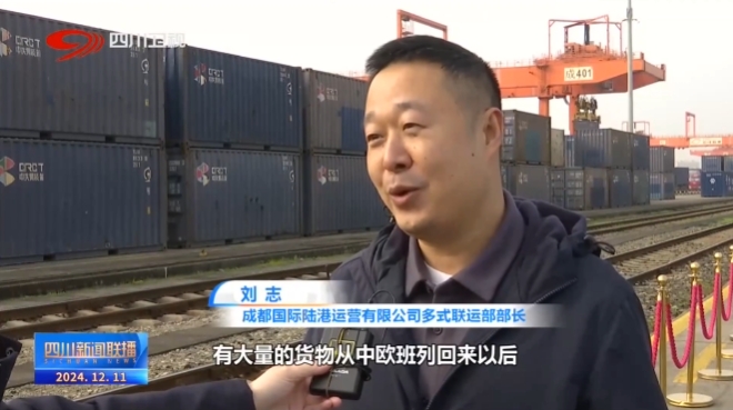 成都國(guó)際陸港運(yùn)營(yíng)有限公司多式聯(lián)運(yùn)部部長(zhǎng) 劉志:中歐班列和“長(zhǎng)江班列”的始發(fā)車站都是在這里(成都青白江城廂站),所以是“無縫銜接”,有大量的貨物從中歐班列回來以后會(huì)分撥到長(zhǎng)江流域的其它地方去,“長(zhǎng)江班列”大大地促進(jìn)了物流通道的便捷性,促進(jìn)了中歐班列的國(guó)際貿(mào)易和長(zhǎng)江流域的企業(yè)之間的完美銜接。