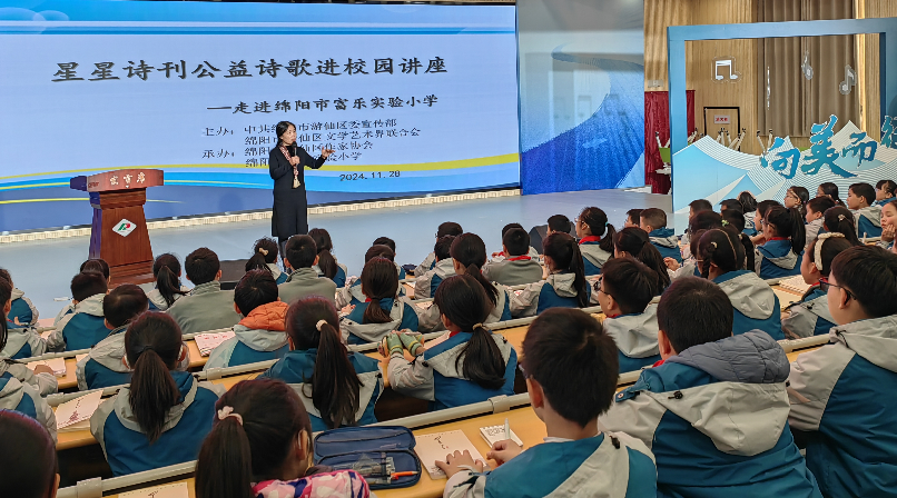 為了進(jìn)一步弘揚(yáng)優(yōu)秀詩歌文化,培養(yǎng)學(xué)生對詩歌的興趣。近日,《星星》詩刊“以美育人 向美而行”為主題的 “詩歌進(jìn)校園”公益講座走進(jìn)了綿陽市富樂實(shí)驗(yàn)小學(xué)。