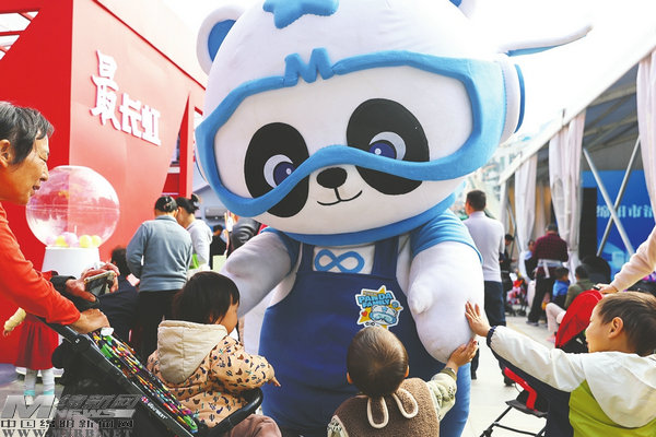 12月18日,綿陽市“文化三推”深圳行啟幕。在南山區(qū)文體中心廣場,大熊貓玩偶與兒童互動。
