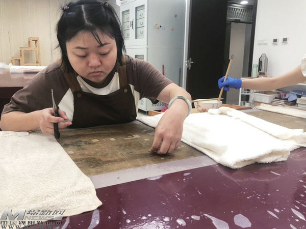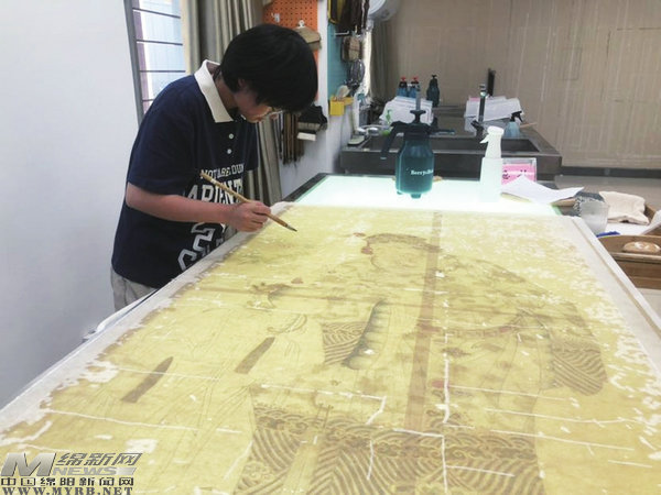 “書畫修復(fù)急不來,慢工才能出細(xì)活。”王靜抬頭沖記者莞爾一笑,娓娓講道,書畫修復(fù)工序繁多,最重要的是“洗、揭、補(bǔ)、全”四道工序,她正在進(jìn)行的即是全色步驟。