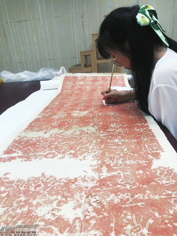 長發(fā)披肩的王靜握著一支小號毛筆,正低頭對案桌上一幅胡雪海的楷書拓片一點(diǎn)點(diǎn)描補(bǔ)。這幅長卷拓片紅底白字,有的字跡已斑駁模糊,有的詞句已完全斷字脫節(jié)。她輕輕用筆尖醮上紅色顏料,再在紅色背底殘缺的地方小心補(bǔ)全。