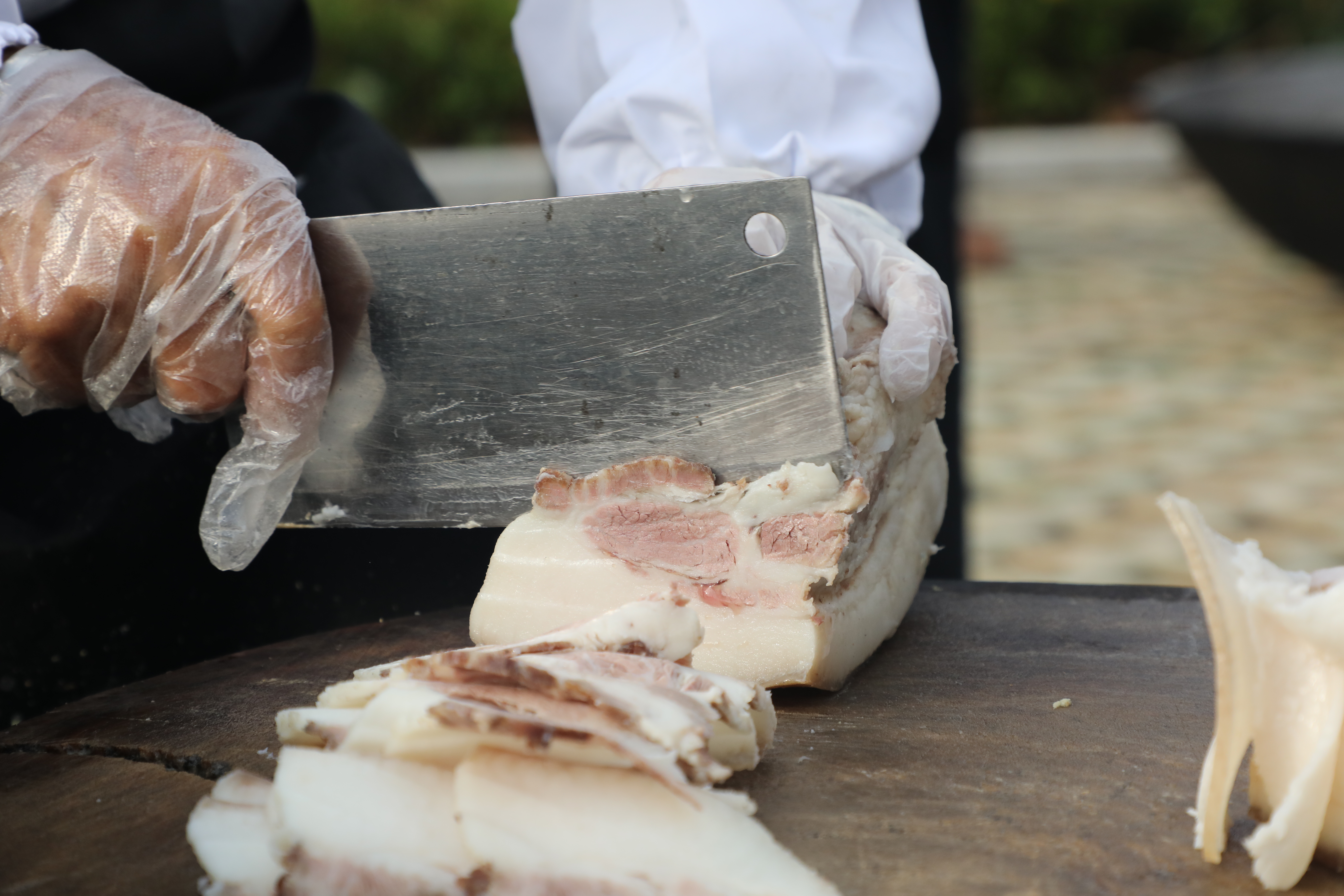 俗話說(shuō),“無(wú)‘鮮’不成席,無(wú)香不成禮。”“鮮”與“香”的味蕾碰撞是德昌刨湯宴的精髓所在。本次刨湯宴食材來(lái)自于德昌土生土長(zhǎng)的生態(tài)豬,這些豬以綠色草料和谷物為食,肉質(zhì)緊實(shí)且富有彈性。隨著一大鍋刨湯在熱烈的火爐上翻滾,濃郁的肉香瞬間彌漫開來(lái)。人們將煮過(guò)的肉撈出、切成片,再洗凈一把蒜苗,用自家腌制的豆瓣翻炒,一道色香味俱全的回鍋肉便成了型。