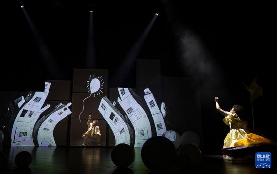 12月24日,演員在北京老舍劇場表演影像戲劇《1033》。