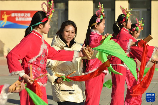 12月22日,在南皮縣馮家口鎮(zhèn)車官屯小學(xué),滄州落子藝人在指導(dǎo)學(xué)生練習(xí)滄州落子。