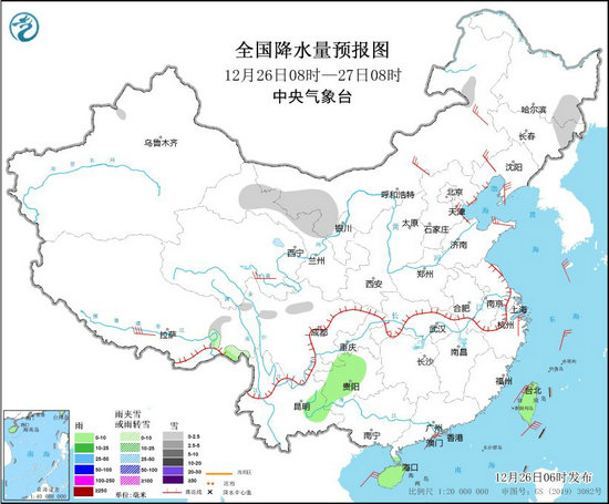 全國降水量預(yù)報(bào)圖(12月26日08時(shí)-27日08時(shí))