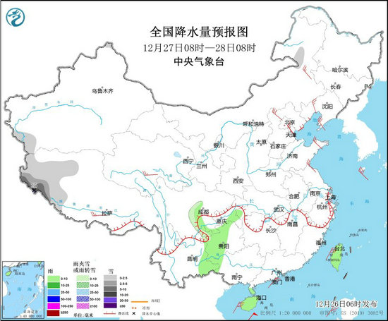 全國降水量預(yù)報(bào)圖(12月27日08時(shí)-28日08時(shí))