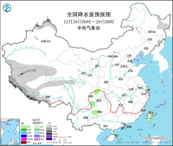 12月28日08時(shí)至29日08時(shí),新疆北疆北部、西藏北部和西南部、青海南部和西部、黑龍江東北部、吉林東部等地部分地區(qū)有小到中雪,其中,新疆北疆北部高海拔地區(qū)、西藏西南部等地部分地區(qū)有大到暴雪,西藏西南部局地大暴雪(20~25毫米)。四川盆地北部和西南部、貴州西南部、臺灣島東部等地部分地區(qū)有小雨。西藏南部、內(nèi)蒙古中西部、遼東半島、浙江東部沿海等地部分地區(qū)有4~6級風(fēng);黃海南部海域、臺灣海峽、臺灣以東洋面、巴士海峽、南海北部和中部海域、北部灣將有7~8級、陣風(fēng)9~10級的大風(fēng)。