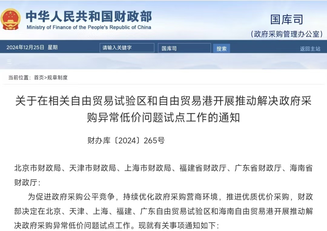 財(cái)政部12月25日對外發(fā)布了關(guān)于在相關(guān)自由貿(mào)易試驗(yàn)區(qū)和自由貿(mào)易港開展推動解決政府采購異常低價(jià)問題試點(diǎn)工作的通知,明確了上述安排。