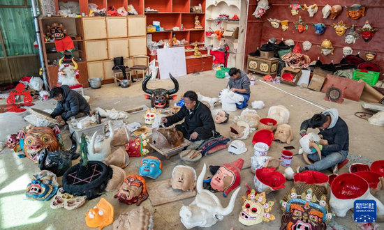 12月9日,拉薩布制面具制作技藝西藏自治區(qū)級非遺傳承人西洛(中)和同事一起制作西藏傳統(tǒng)面具。西洛是拉薩布制面具制作技藝的西藏自治區(qū)級非遺傳承人,他制作的面具廣泛運(yùn)用于藏戲表演中。2012年,在政府的扶持下,西洛創(chuàng)辦了拉薩市達(dá)孜區(qū)雪鄉(xiāng)扎西崗傳統(tǒng)手工藝合作社。近年來,合作社不斷吸納當(dāng)?shù)厝罕妼W(xué)習(xí)面具制作技藝,不僅為當(dāng)?shù)厝罕娞峁┚蜆I(yè)機(jī)會,同時也助力非物質(zhì)文化遺產(chǎn)的保護(hù)和發(fā)展。