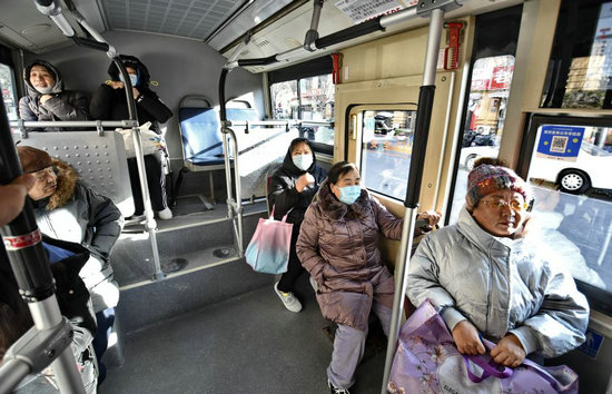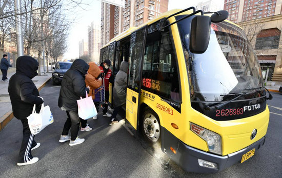 12月25日,花園閘社區(qū)的居民乘坐“溫暖小公交”。