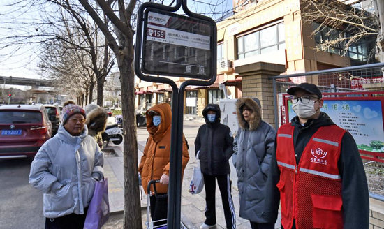 12月25日,朝陽區(qū)高碑店鄉(xiāng)花園閘社區(qū)的志愿者在公交站引領(lǐng)居民候車。